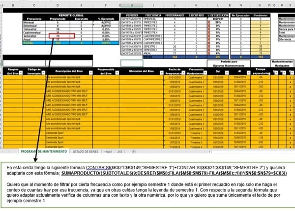 Solicito el apoyo de ustedes para que pueda aplicar la fórmula subtotales con la función contar. Si o contá. Si. Conjunto para una base de datos en Excel, tal como se muestra en la imagen, lo que deseo es que me haga el recuento de cierta frecuencia al momento de filtrar. Actualmente tengo esta fórmula que cuando filtra realiza la sumatoria pero lo hace en base a dos columnas en una hay texto (columna "N" y en la c83 esta el texto de referencia que busca) y en la otra numérico (columna "M" están los montos) por lo que el resultado que muestra es la sumatoria de la columna que son los montos y lo que yo necesito es que únicamente lo haga en una columna y que muestre la sumatoria del texto