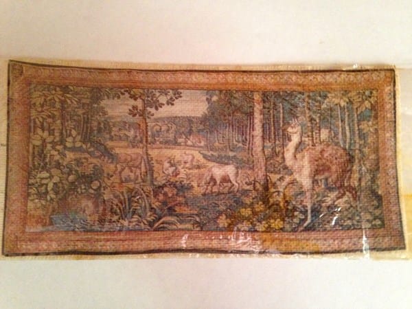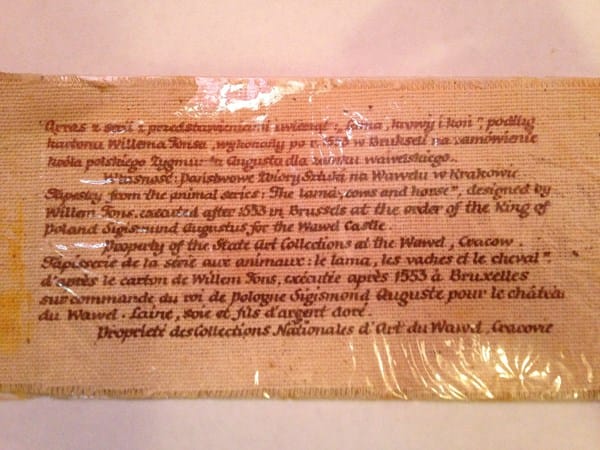 Encontre, adentro de un libro viejo de mi casa, un tapiz antiguo que tenía un paisaje con animales en un sobre plástico transparente, con una inscripción en polaco, inglés y francés, la inscripción decía en inglés: