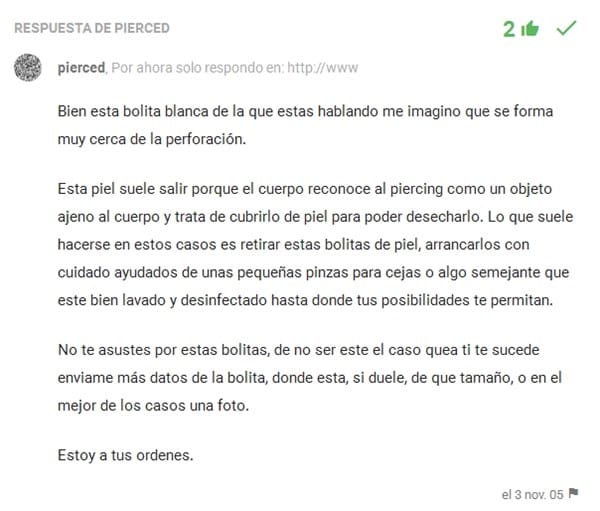 Según he leido, esta piel de color blanco suele aparecer porque el cuerpo reconoce al piercing como un objeto ajeno al cuerpo y trata de cubrirlo de piel para poder desecharlo. Comentó que lo que suele hacerse en estos casos es retirar estas bolitas o 'capas' de piel, arrancarlas con cuidado ayudados de unas pequeñas pinzas para cejas o algo semejante que este bien lavado y desinfectado hasta donde sus posibilidades le permitan.