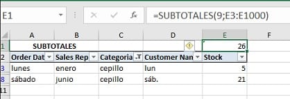 En una hoja, utilizando la herramienta de subtotales deseo encontrar el total de unidades en Stock por Categoría