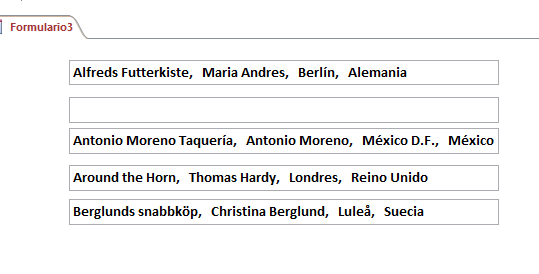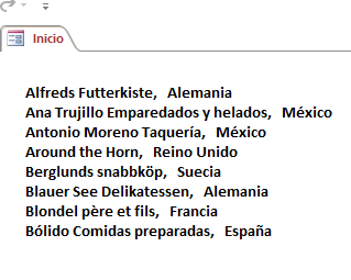 Private Sub Form_Load() Dim I As Byte, s As String For I = 1 To 8 s = "" & s & "" + vbCrLf + DLookup("nombrecliente", "usar", "idcliente=" & I & "") & ", " & DLookup("pais", "usar", "idcliente=" & I & "") Next Etiqueta3.Caption = Right("" & s & "", Len("" & s & "") - 1) End Sub