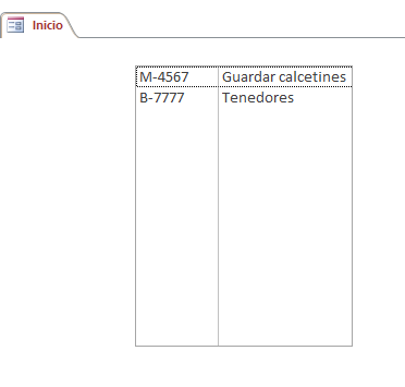 Hola Icue Lo probé y tengo que estar haciendo algo mal. Paso a explicarte mejor: tengo una base de datos que al abrir carga un formulario inicial con botones que ejacutan tablas y consultas, lo que quiero hacer es que al cargarse ese formulario aparezcan dos etiquetas y en su caption ponga lo que hay dentro de la tabla cajones que tiene dos campos uno Nºcajon y el tor Modelo . experto que esta explicación sea buena ya que lo anterior lo probé y no va. Gracias