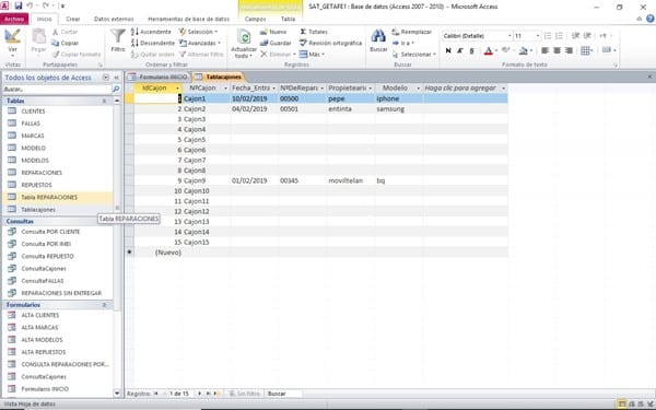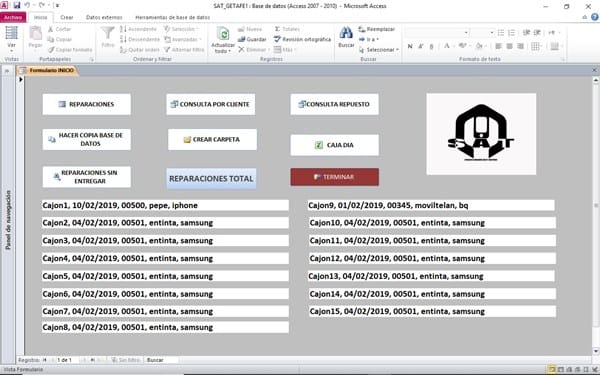 ¡Gracias! Estoy con tigo es mejor el cuadro de lista, pero el programa es para mi hermano y es maniático lo quier así quiere visión siempre y no tener que desplegar o ejecutra nada, y con respecto a la eliminación e creado una consulta de actualización para no tener que perder ni el id ni el Nºcajón tiene que ser siempre esos 15 sólo cambiar los datos si se entrega una reparación dejar el mismo cajón con el texto "Vacio", la consulta de actualización lo realiza.