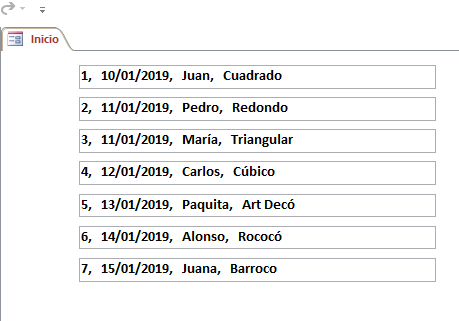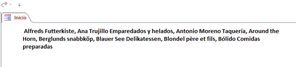 Private Sub Form_Load() Dim I As Byte, s As String For I = 1 To 8 s = "" & s & "" & ", " & DLookup("nombrecliente", "usar", "idcliente=" & I & "") Next Etiqueta3.Caption = Right("" & s & "", Len("" & s & "") - 1) End Sub