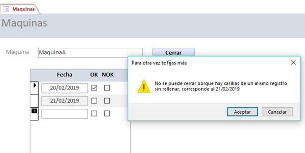 If DCount("*", "revisiones", "ok=0 and nok=0 and idmaquina=" & Me.IdMaquina & "") >= 1 Then Dim d d = DLookup("fecha", "revisiones", "ok=0 and nok=0 and idmaquina=" & Me.IdMaquina & "") MsgBox "No se puede cerrar porque hay casillas de un mismo registro" + Chr$(10) + "sin rellenar, corresponde al " & d, vbOKCancel + vbExclamation, "Para otra vez te fijas más" Exit Sub Else DoCmd.Close End If