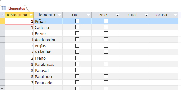 Ok pero yo no quiero añadir registros en la tabla Elementos (porque las máquinas siempre tienen los mismos elementos) lo que variará será el día, es decir, yo voy el lunes y hago el checklist. Piñon OK, Parabrisas NOK, .... en fecha (13/02/2019). Y el siguiente lunes vuelvo a hacer el checklist Piñón NOK, Parabrisas OK.