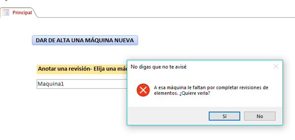 Private Sub Comando0_Click() DoCmd.OpenForm "MAQUINAS", , , , acFormAdd, acDialog End Sub Private Sub ElegirMaquina_BeforeUpdate(Cancel As Integer) If DCount("*", "revisiones", "idmaquina=" & Me.ElegirMaquina & " and ok=0 and nok=0") >= 1 Then Dim respuesta As Byte respuesta = MsgBox("A esa máquina le faltan por completar revisiones de elementos. ¿Quiere verla?", vbYesNo + vbCritical, "No digas que no te avisé") If respuesta = vbYes Then DoCmd.OpenForm "revisiones", , , "idmaquina=" & Me.ElegirMaquina & " and ok=0 and nok=0" ElseIf respuesta = vbNo Then Exit Sub End If Else DoCmd.SetWarnings False DoCmd.RunSQL "insert into revisiones(idmaquina,idelemento) select idmaquina,idelemento from elementos where idmaquina=" & Me.ElegirMaquina & "" DoCmd.OpenForm "revisiones", , , "idmaquina=" & Me.ElegirMaquina & " and fecha is null", , acDialog End If End Sub