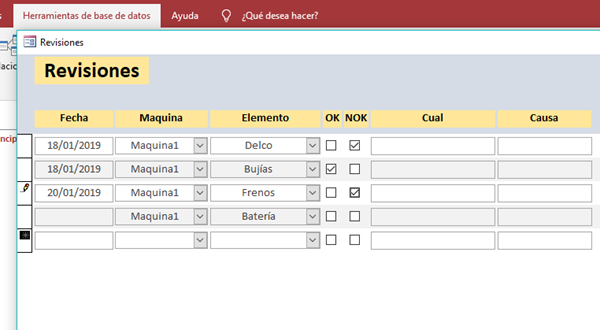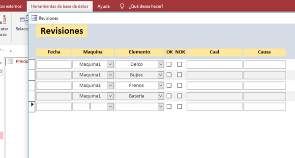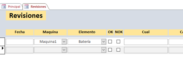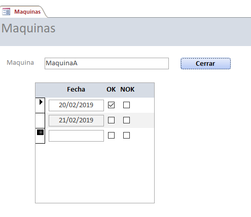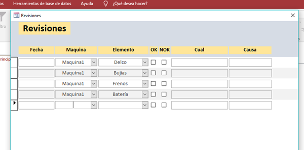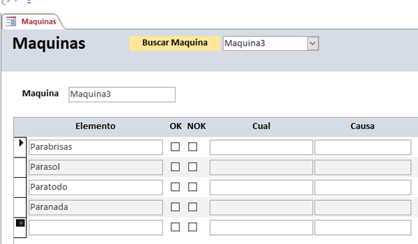Te pongo un poco en contexto. Mi idea es que los operarios de las maquinas rellenen el formulario, y quiero que ellos sólo tengan permiso para ir máquina por máquina (en el Formulario) poniendo OK o NOK a cada elemento de cada máquina, y en el caso que algo esté NOK que en los campos Cual y Causa puedan rellenar lo que ellos quieran. Cuando terminen de poner OK o NOK a cada elemento de cada maquina tienen que cerrar para otro dia que se haga mantenimiento, al abrir el formulario les aparezca todo blanco para poder rellenar de nuevo.