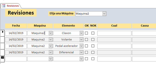 Ya casi lo tengo, ahora me falta restringir en el formulario.. ya que si selecciono la Maquina 1 y luego la 2, se me añaden los registros y me gustaría que al clicar la máquina (cuadro combinado), en el Formulario, me salieran sólo los elementos de la maquina. (no sé si me he explicado) Y que al detectar que todos los elementos tienen un OK o NOK saliera un mensaje diciendo que ya está completo el Checklist de la Máquina 1, por ejemplo.