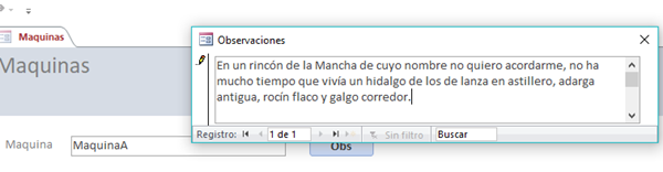 Maquinas, si pulso el botón Obs, se abre en vista diálogo y en un registro nuevo el formulario Observaciones, anoto lo que tenga que anotar, y como en el evento Al activar el registro de éste último tengo puesto