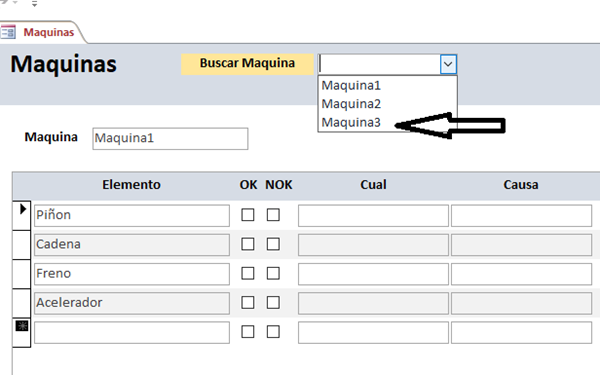 Me gustaría hacer una especie de checklist con un formulario de Access. Cada Máquina tiene una serie de elementos. De momento he creado una tabla que tiene un campo Elementos y otro Máquinas por cada máquina hay varios elementos, así que las Máquinas es el campo que se repite (hice esta tabla pensando en hacer cuadros combinados en cascada aunque no es lo que realmente quiero). Quiero que en el formulario aparezca un cuadro combinado con las máquinas y que al seleccionar una máquina salga la lista de elementos posibles para la Máquina en cuestión y que se pueda rellenar el estado de cada uno de los elementos de ésta máquina y que al dar a siguiente se guarden todos los elementos con los checks en una tabla. Los datos que tengo que manejar son éstos: