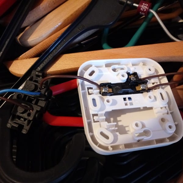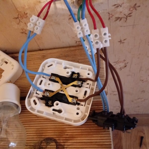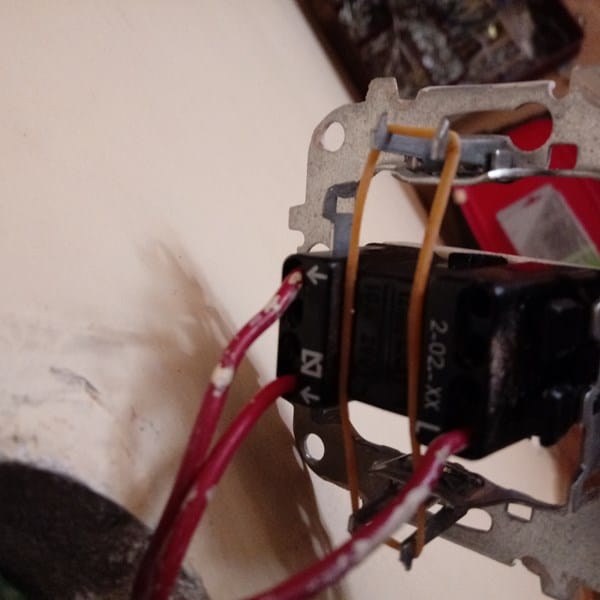 4) En la foto 2 quiero suponer que el mecanismo de la izquierda es un enchufe de 10A y, si se han respetado los colores correctamente (cosa que empiezo a dudar), el cable azul en ese enchufe sería el neutro y por lo tanto, el cable pequeño que se conecta desde dicho enchufe al conmutador tendría que ir al borne del cable marrón, no en el borne del cable azul. Habría que comprobar con un buscapolos si el cable marrón que llega al enchufe es la fase, porque si así fuera tendrías que conectarlo tal y como te he indicado anteriormente.