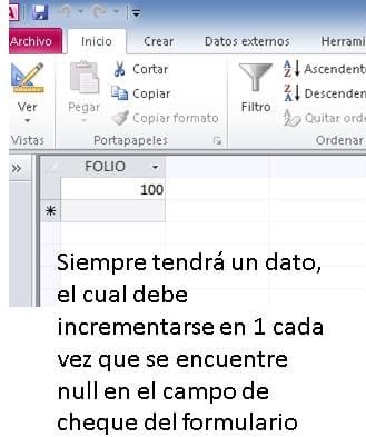 La tabla folio siempre tendrá solamente un registro numérico que irá cambiando cada vez que se ejecute el programa.