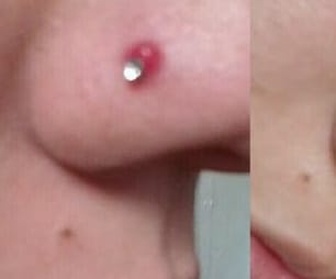 Saludos, me hice mi piercing en la nariz y al segundo día me lo quité para limpiar la zona, nadie me dijo que no podía quitármelo hasta que sanara y resulta que la perforación por dentro se cerró y al 4 día tuve que ir donde me lo hice para ver que pasaba y el chico lo que hizo fue hacerme otro perforación encima del que tenía pero no cayó donde iba y ahora me salió una bola dentro y afuera de la nariz y me duele, la verdad no quiero que me quede eso ahí en la nariz y no sé que hacer, me la esprimi y salió como pus ligada con sangre y la bola está como llena de aire y no se baja sigue igual de grande, alguien que me pueda ayudar por favor ???? - Julisa Familia