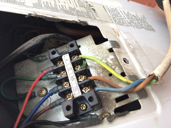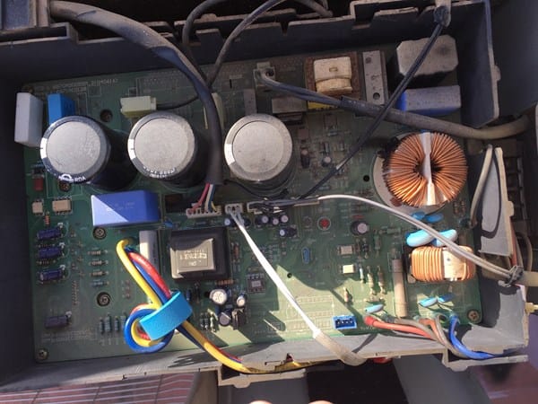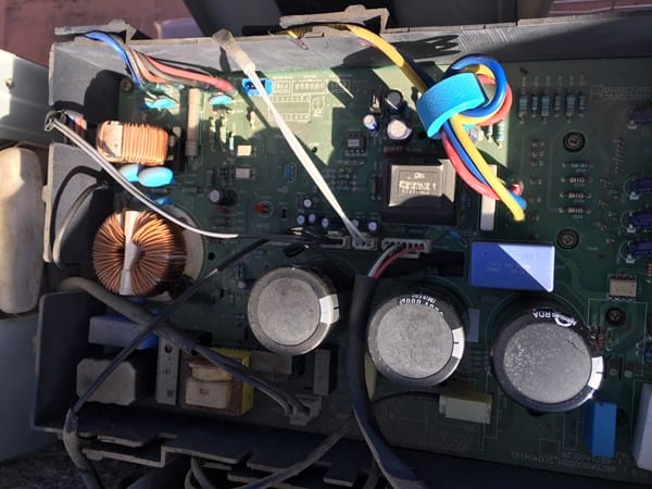 He visto en la unidad exterior que la toma de tierra estaba conectada a una conexión etiquetada con el numero 3 (ver imagen), y la placa tiene uno de los componentes quemados (ver imagen). Deduzco que el problema es de la placa pero el hecho que el cable de masa no este en su sitio ha influido tal vez.