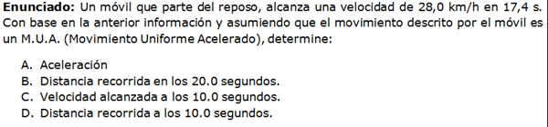 Un móvil que parte del reposo, alcanza una velocidad de 28,0 km/h en 17,4 s. Con base en la anterior información y asumiendo que