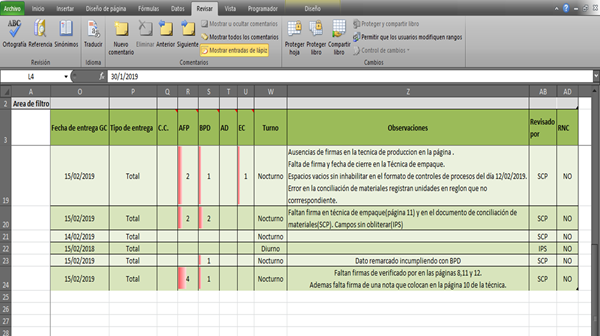 Ahora estuve probando la función de excel "Control de cambios" y esta se inhabilita al insertar una tabla, les dejo una imagen del formato que estoy usando.