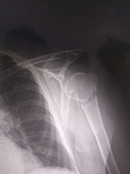 El hueso humero del brazo derecho está safado (dislocado), pero quisiera saber si la diafisis está rota, justo abajo de la epífisis.