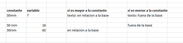 Tengo una constante ejem: 50 mm y una variable "x" pero de ese valor que me arroje como resultado debo tener un texto, como si es menor de la contante el texto deberá decir: "en relación a la base" en caso contrario: "fuera de la base", necesito ver una fórmula para arrojar esos datos