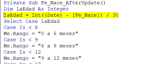 [edad]>=0 y [edad]<=5 estblecer valor [Edad] expersión "0 a 5 meses"