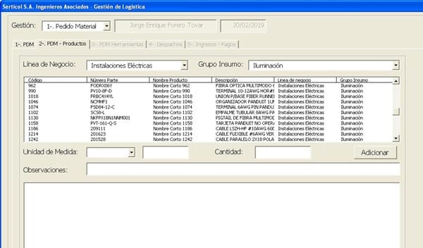 Private Sub UserForm_Activate() mlpPDM("pag1PDM").Enabled = False mlpPDM("pag2PDMMateriales").Enabled = False mlpPDM("pag3PDMHerramientas").Enabled = False mlpPDM("pag4Despachos").Enabled = False mlpPDM("pag5Ajustes").Enabled = False End Sub Private Sub cmbTipoGestionLogistica_Change() 'Trae Usuario y Fecha txbNombreUsuarioPDM.Value = Worksheets("Calculo").Range("b1") txbFechaPDM.Value = Format$(Date, "dd/mm/yyyy") txbNombreUsuarioPDM.Enabled = False txbFechaPDM.Enabled = False 'Inicia selección de la Gestión If cmbTipoGestionLogistica.Value = "1-. Pedido Material" Then 'habilita la pestaña a trabajar mlpPDM("pag1PDM").Enabled = True mlpPDM("pag2PDMMateriales").Enabled = True mlpPDM("pag3PDMHerramientas").Enabled = False mlpPDM("pag4Despachos").Enabled = False mlpPDM("pag5Ajustes").Enabled = False End If If cmbTipoGestionLogistica.Value = "3-. Herramientas" Then 'habilita la pestaña a trabajar mlpPDM("pag3PDMHerramientas").Enabled = True mlpPDM("pag1PDM").Enabled = False mlpPDM("pag2PDMMateriales").Enabled = False mlpPDM("pag4Despachos").Enabled = False mlpPDM("pag5Ajustes").Enabled = False End If If cmbTipoGestionLogistica.Value = "4-. Despachos" Then 'habilita la pestaña a trabajar mlpPDM("pag4Despachos").Enabled = True mlpPDM("pag1PDM").Enabled = False mlpPDM("pag2PDMMateriales").Enabled = False mlpPDM("pag3PDMHerramientas").Enabled = False mlpPDM("pag5Ajustes").Enabled = False End If If cmbTipoGestionLogistica.Value = "5-. Ajustes" Then 'habilita la pestaña a trabajar mlpPDM("pag5Ajustes").Enabled = True mlpPDM("pag1PDM").Enabled = False mlpPDM("pag2PDMMateriales").Enabled = False mlpPDM("pag3PDMHerramientas").Enabled = False mlpPDM("pag4Despachos").Enabled = False End If End Sub 'Gestiona el pedido en los textbox, combobox y calendar Private Sub btnCalFechaEntergaMaterial1_Click() txbFechaEntrega1.Enabled = False Call AbrirCalendariobtnCalFechaEntergaMaterial1 End Sub Private Sub cmbCodigoProyectoPDM1_Change() DatoBuscar = cmbCodigoProyectoPDM1.Value Set buscar = Worksheets("Tablas").Range("l:m").Find(DatoBuscar, LookIn:=xlValues, LookAt:=xlWhole) If Not buscar Is Nothing Then txbNombrePRoyectoPDM1.Text = buscar.Offset(0, 1) End If txbNombrePRoyectoPDM1.Enabled = False End Sub Private Sub btnSalir_Click() frmLogistica.Hide End Sub 'Selecciona Línea de Negocio / Grupo de Insumos Private Sub cmbLineaNegocio2_Change() Dim FUNCION As WorksheetFunction Dim UNICOS As New Collection Set FUNCION = WorksheetFunction Set PRODUCTOS = Range("TABLA_PRODUCTOS") LINEA = cmbLineaNegocio2.Value With PRODUCTOS FILAS = .Rows.Count columnas = .Columns.Count cuenta = FUNCION.CountIf(.Columns(columnas - 1), LINEA) INDICE = FUNCION.Match(LINEA, .Columns(columnas - 1), 0) Set insumos = .Rows(INDICE).Resize(cuenta) End With cmbGrupoInsumo2.Clear lbxProductos.RowSource = Empty With insumos FILAS = .Rows.Count columnas = .Columns.Count For I = 1 To FILAS insumo = .Cells(I, columnas) On Error Resume Next UNICOS.Add insumo, CStr(insumo) If Err.Number = 0 Then cmbGrupoInsumo2.AddItem insumo On Error GoTo 0 Next I .Name = "INSUMOS" End With Set FUNCION = Nothing: Set PRODUCTOS = Nothing End Sub Private Sub cmbGrupoInsumo2_Change() Dim FUNCION As WorksheetFunction Set FUNCION = WorksheetFunction Set insumos = Range("INSUMOS") insumo = cmbGrupoInsumo2.Value If insumo = Empty Then GoTo sal With insumos FILAS = .Rows.Count columnas = .Columns.Count cuenta = FUNCION.CountIf(.Columns(columnas), insumo) INDICE = FUNCION.Match(insumo, .Columns(columnas), 0) Set TABLA = .Rows(INDICE).Resize(cuenta) End With With Sheets("ConsultaProductos") .Cells.Clear TABLA.Copy: .Range("A3").PasteSpecial xlPasteValues Range("TABLA_PRODUCTOS").Rows(1).Copy: .Range("A2").PasteSpecial xlPasteValues Set destino = .Range("a2").CurrentRegion With destino Set destino = .Rows(2).Resize(cuenta) End With With lbxProductos .RowSource = "ConsultaProductos!" & destino.Address .ColumnCount = columnas .ColumnHeads = True End With End With Set destino = Nothing: Set insumos = Nothing: Set FUNCION = Nothing sal: End Sub Private Sub frmLogistica_Activate() With frmLogistica .Caption = "MODULO DE PRODUCTOS" .Move 150, 10 End With End Sub Private Sub frmLogistica_Initialize() End Sub Sub LINEAS_UNICAS() Set PRODUCTOS = Range("TABLA_PRODUCTOS") With PRODUCTOS FILAS = .Rows.Count columnas = .Columns.Count .Columns(columnas + 3).CurrentRegion.Clear Set UNICOS = .Columns(columnas + 3).Resize(FILAS, 1) .Columns(5).Copy End With With UNICOS .PasteSpecial xlValues .RemoveDuplicates Columns:=1 FILAS = .CurrentRegion.Rows.Count MATRIZ = .Rows(2).Resize(FILAS - 1) cmbLineaNegocio2.List = MATRIZ .CurrentRegion.Clear End With End Sub Private Sub UserForm_Initialize() Set hp = Worksheets("productos") Set PRODUCTOS = hp.Range("A1").CurrentRegion With PRODUCTOS .Sort KEY1:=hp.Range(.Columns(5).Address), ORDER1:=1, _ KEY2:=hp.Range(.Columns(6).Address), ORDER2:=1, _ Header:=xlYes .Name = "TABLA_PRODUCTOS" End With LINEAS_UNICAS Set PRODUCTOS = Nothing End Sub