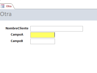 Por otro lado, olvídate del evento Al perder el foco, tal como te puse el código, si el cursor se moviera, sea con el tabulador, sea con lo que sea al CampoB, como en sus propiedades-eventos-Al recibir el enfoque le tengo puesto que si CampoA es nulo o vacío, se vaya a ese campo. Ya puedes hacer lo que quieras, que el cursor siempre volverá, mientras se dé esa circunstancia. Lo mismo digo para el control Nombrecliente. Además, si le tengo puesto que al activar registro se vaya siempre al CampoB, se irá allí te pongas como te pongas.