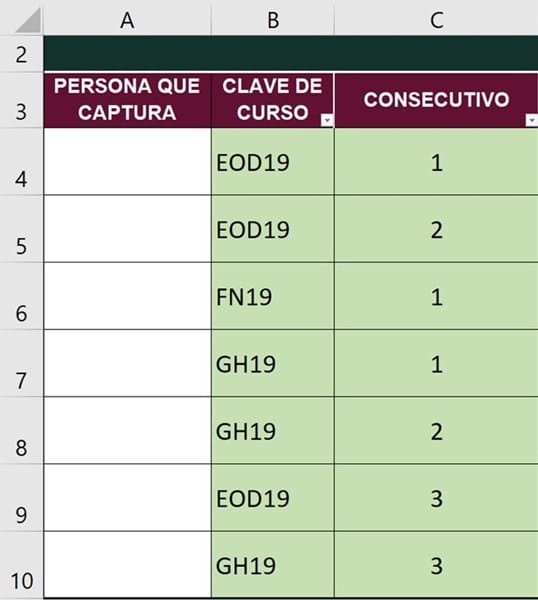 Tengo una Lista desplegable con 3 criterios en la Columna B (Clave). Quiero generar un consecutivo, en la Columna C (Consecutivo), para cada criterio de la Columna B, según se vaya requiriendo. Necesito una fórmula que lea todo el rango de la Columna C y ubique el último consecutivo de acuerdo al criterio de la Columna B y le asigne uno más (+1). Les pongo una imagen para que se den una mejor idea.