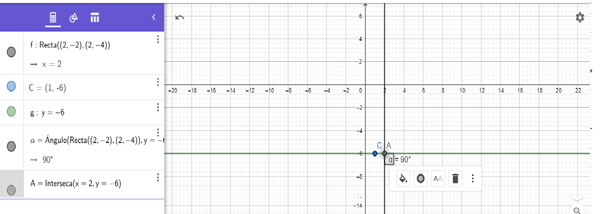 - Hallar la ecuación de la recta que pasa por el punto C y es perpendicular a la recta que pasa por los puntos A y B. Graficar las dos rectas en GeoGebra encontrando su punto de intersección y verificando el ángulo entre ellas. Garcías por su ayuda