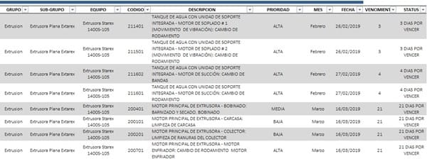 Tengo un detalle con el envió de correos a varios destinatarios según unas condiciones. En una tabla contenida en una hoja ("MANTENIMIENTO PREVENTIVO") de 10 columnas, en la misma llevo la frecuencia de mantenimiento a varios equipos. El objetivo de la macro es enviar un correo al gerente, al jefe de mantenimiento y copia a los supervisores del área justo cuando quedan menos de 5 días para cumplirse la fecha correspondiente, todo esto sucede al abrir el archivo de excel. Les muestro la tabla: