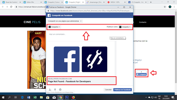 He insertado el botón compartir de facebook pero no vincula a mi página web al intentar subirlo en una fanpage sobre películas estrenos que acabe de abrirlo en la red social ¿por qué puede ser?