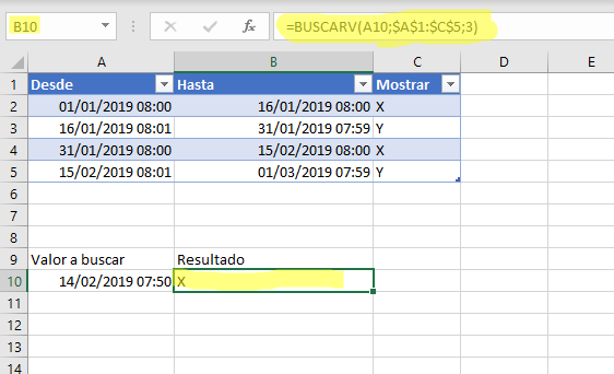 Ej.: Ingreso 14/02/19 7:50 y quiero que me muestre en otra celda el Valor X