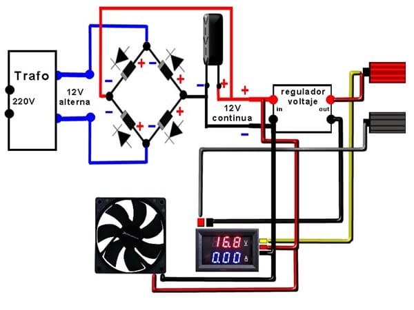 Estoy ensamblando una pequeña fuente de laboratorio usando componentes viejos que tengo, voy a usar un trafo de halógenos (de los que pesan mucho), pero la corriente de salida es de 12V alterna, necesito que sean 12V en continua.
