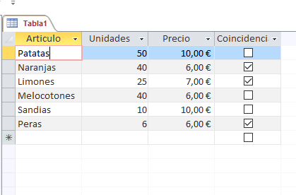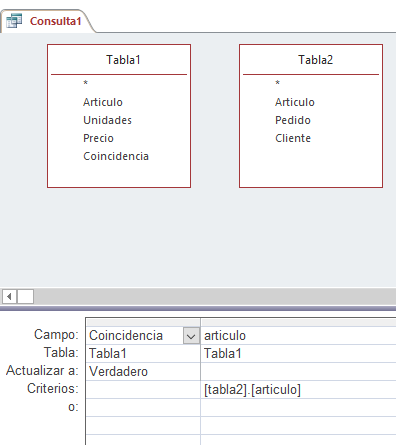 Una vez más recurro a los expertos en busca de ayuda. Tengo dos tablas; ambas tienen campos coincidentes. Lo que quiero es que en la tabla A me indique en un campo SÍ o NO en base a que encuentre coincidencia con un registro de la tabla B. Por ejemplo, en la tabla A tengo un registro con los campos, "Artículo";"Unidades";"Precio Ud." y en la tabla B los campos "Artículo";"Pedido";"Cliente". Lo que quiero es que en la tabla A me marque en el campo "Coincidencia" con un SÍ todos aquellos artículos que estén también en la tabla B. No sé cómo hacerlo mediante UPDATE en SQL. He intentado hacerlo mediante Dlookup en una consulta pero al ser tablas de más de 30.000 registros es demasiado lento pues entiendo que hace búsquedas recursivas cada vez que se modifica un dato y lo que necesito es que se marque el SÍ/NO cada vez que el usuario le da a un botón.
