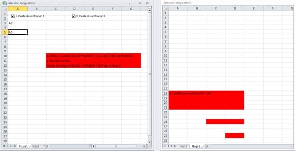Si tildo la 1 casilla de verificación y la casilla 2 de verificación y me situo en la celda A5 de la Hoja1. Se copia el rango A18:D21 + C24:D24 + D27