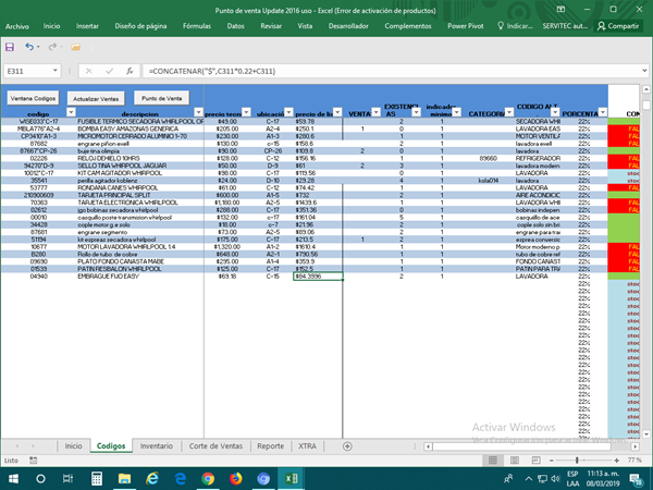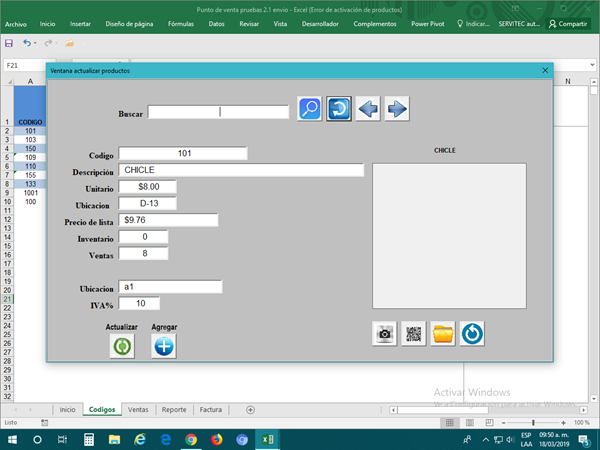 En la hoja códigos se tiene el registro de varios valores que se cargan mediante un formulario, los cuales se van agregando de forma descendiente, se requiere que mediante macros al ingresar un valor en las celdas de la columna "C" se agregue una fórmula en la celda de la columna "E" de la misma fila, ejemplo : mediante el formulario se carga el precio de costo de un articulo en la celda c3 y se requiere que mediante código se cargue automáticamente la fórmula =CONCATENAR("$", C3*0.22+C3), en la celda "E3" que dará el resultado de agregarle un 22 % que seria el precio de venta del articulo, y así consecutivamente con las demás celdas siguientes en forma descendente de la misma columna agradezco mucho sus comentarios y soluciones.