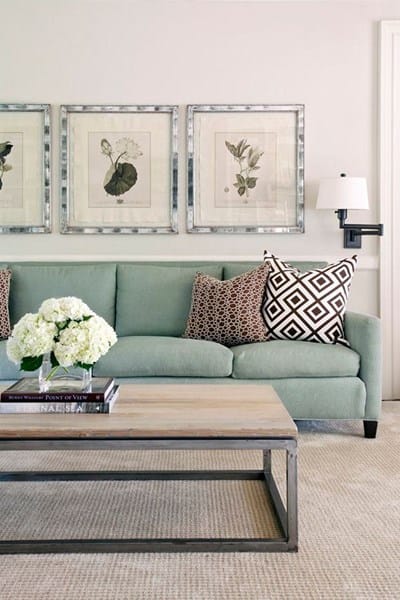 Si el sofá es grande y de color verde mint, ¿De qué color debo pintar las paredes del salón?
