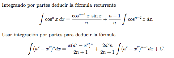 $$\begin{align}&\int \cos^n(x) \,dx=\int \cos(x)\cos^{n-1}(x) \,dx\\&u=\cos^{n-1}(x) \qquad dv=\cos(x)dx\\&du=(n-1)\cos^{n-2}(x)(-\sin(x))\,dx \qquad v=\sin(x)\\&\\&\int \cos^n(x) \,dx=\sin(x)\cos^{n-1}(x)+(n-1) \int \sin(x)\cos^{n-2}(x)\sin(x)\,dx\\&\int \cos^n(x) \,dx=\sin(x)\cos^{n-1}(x)+(n-1) \int \sin^2(x)\cos^{n-2}(x)\,dx\\&\int \cos^n(x) \,dx=\sin(x)\cos^{n-1}(x)+(n-1) \int (1- \cos^2(x))\cos^{n-2}(x)\,dx\\&\int \cos^n(x) \,dx=\sin(x)\cos^{n-1}(x)+(n-1) \int \cos^{n-2}(x)\,dx-(n-1)\int \cos^n(x) \,dx\\&n\int \cos^n(x) \,dx=\sin(x)\cos^{n-1}(x)+(n-1) \int \cos^{n-2}(x)\,dx\\&\int \cos^n(x) \,dx=\frac{\sin(x)\cos^{n-1}(x)+(n-1) \int \cos^{n-2}(x)\,dx}{n}\end{align}$$$$\begin{align}&\int (a^2-x^2)^n \,dx\\&u=(a^2-x^2)^n \qquad \,dv=\,dx\\&\,du=n(a^2-x^2)^{n-1}(-2x) \,dx \qquad v=x\\&=x(a^2-x^2)^n+2n \int x(a^2-x^2)^{n-1}xdx=\\&x(a^2-x^2)^n+2n \int x^2(a^2-x^2)^{n-1}dx=\\&x(a^2-x^2)^n+2n \int (x^2+a^2-a^2)(a^2-x^2)^{n-1}dx=\\&x(a^2-x^2)^n-2n \int (-x^2-a^2+a^2)(a^2-x^2)^{n-1}dx=\\&x(a^2-x^2)^n-2n \int (-x^2+a^2)(a^2-x^2)^{n-1}dx-2a^2n\int (a^2-x^2)^{n-1} \,dx=\\&\\&\int (a^2-x^2)^n \,dx=x(a^2-x^2)^n-2n \int (a^2-x^2)^{n}dx-2a^2n\int (a^2-x^2)^{n-1} \,dx=\\&(1+2n)\int (a^2-x^2)^n \,dx=x(a^2-x^2)^n-2a^2n\int (a^2-x^2)^{n-1} \,dx=\\&\int (a^2-x^2)^n \,dx=\frac{x(a^2-x^2)^n-2a^2n\int (a^2-x^2)^{n-1} \,dx}{2n+1}\\&\\&\end{align}$$En la 6ta linea sumé y resté a^2 para que quedara -x^2-a^2+a^2 multiplicando a lo que esta dentro del parentesis, luego lo separé en -x^2+a^2 y -a^2