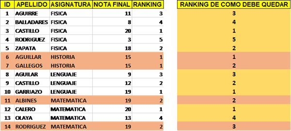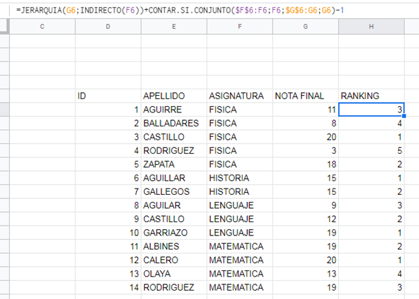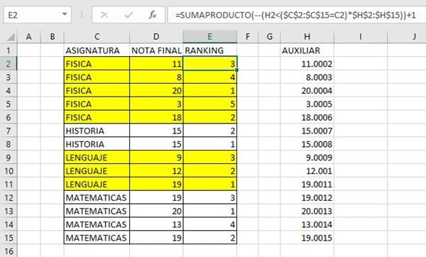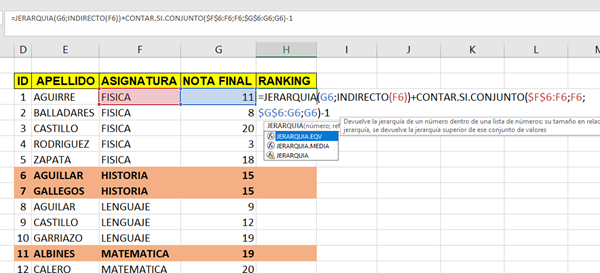 Tengo una hoja de calculo donde me calcula el orden de merito con dos criterios de los alumnos dependiendo de la nota y su grupo de asignaturas sin repetir y para un criterio usaba la función la JERARQUIA+CONTARSI para evitar se duplique el ranking, ahora he probado la función =SUMAPRODUCTO(--($C$2=$C$2:$C$14); --($D$2<$D$2:$D$14))+ 1, en este casi me calcula el orden de merito por criterio pero con la dificultad de cuando hay nota repetida no se salta el orden lo duplica y no yo no quiero que lo duplique que siga su correlativo. No se si alguien me puede apoyar con otra función.