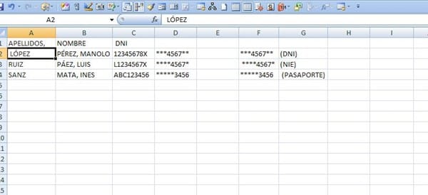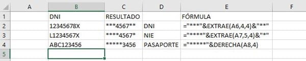 Si tienes una base de datos grande usar fórmulas te hará muy lento el excel mira este es el resultado de la macro, en la columna DE coloca los números según la columna F, la macro funciona así, le cada celda de la columna DE y si la inicial es numero y el final es letra considerara que es DNI y cambiara los caracte por astericos con la configuración de la columna F, si la inicla es letra y el final es letra pondrá asteriscos como si fuera un NIE y si la inicial es una letra y el final es un numero pondrá astericos en configuración pasaporte por cierto aquí funciona para ambos casos en letras mayúsculas y minúsculas