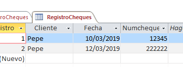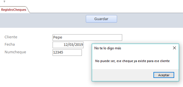Estoy haciendo una base de datos en Access para registrar los cheques que me entregan los clientes y quiero crear una función que me lance un mensaje si cargo un cliente y luego un numero de cheque y ya existe en la base de datos... Se hacerlo solo con el numero de cheque pero lo que no se hacer es si el numero de cheque es el mismo pero lo que cambia es el cliente... Cualquier comentario o ayuda me vendría muy bien!