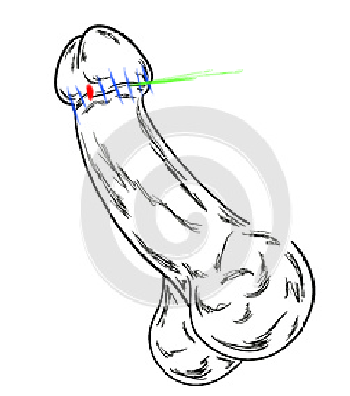 Te adjunto un gráfico dónde marco en azul la zona donde se me cae la piel, en rojo donde tengo unido el frenillo (piel-pene) y en verde hasta donde me baja la piel (a partir de ahí me tira).