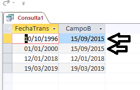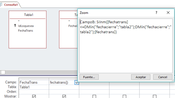 En Access que me entregue una fecha de acuerdo a una condición "SI". En una tabla de transacciones tengo registros donde uno de los campos tiene la fecha de transacción. En otra tabla tengo las "fechas de cierre" de dichas transacciones (normalmente son tres fechas consecutivas por el fin de semana o días festivos). Pueden haber fechas de trx antiguas en cada período de cierre. Tengo que crear un campo que, de acuerdo a la fecha de transacción, le asocie la fecha de cierre sí es que la fecha de transacción es menor o igual a la menor fecha de la tabla de fechas de cierre y, si es mayor, entonces es igual a la fecha de transacción. He intentado, ´pero arrojándome error, algo como: IIF(Fecha_trx<=Mín(Fecha_Cierre), Mín(Fecha_Cierre). Fecha_trx). Esto me asegura que todas las fechas de transacciones antiguas queden en la primera fecha de cierre y las transacciones actuales queden en las otras fechas de cierre.