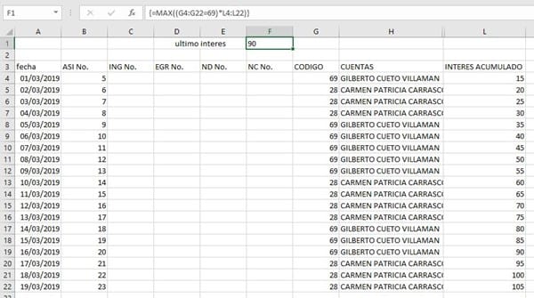 Tengo una lista que consta de las columnas nombre, código, abono, interés acumulado. En otra hoja quiero extraer el último registro del interés acumulado por que la fórmula que tengo lo que hace es que suma todos los intereses acumulado de un cliente determinado.
