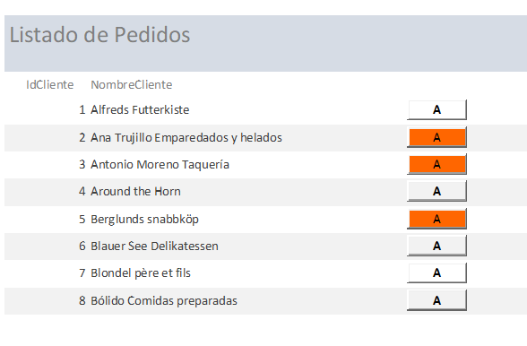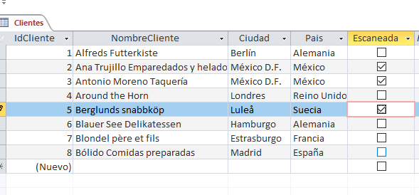 Hago un informe en vista diseño, donde oculto la casilla Escaneada y le pongo un cuadro de texto, que tiene el mismo evento Al hacer clic que un botón. A este cuadro de texto, en formato condicional le digo que si el valor de Escaneada=true entonces su color de fondo cambie a naranja y