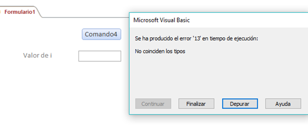 Como ves, he definido i como número, pero en la instrucción le estoy diciendo que su valor sea texto(nombrecliente), por tanto cuando pulso el botón