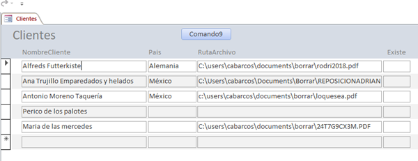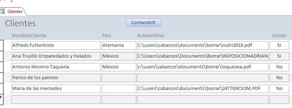 Public Function existearchivo(ruta As String) As Boolean If Len(Dir(ruta)) > 0 Then existearchivo = True Else existearchivo = False End If End Function Private Sub Comando9_Click() Dim i As Byte DoCmd.GoToRecord , , acFirst For i = 1 To Me.Recordset.RecordCount If IsNull([RutaArchivo]) Then Existe = "No" ElseIf existearchivo([RutaArchivo]) = True Then Existe = "Si" Else Existe = "No" End If DoCmd.GoToRecord , , acNext Next End Sub