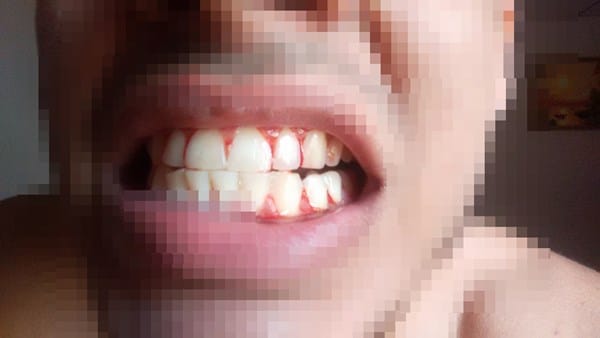 Querida comunidad, desde hace tiempo, y hablo de quizás ya varios meses, he notado que me sangran las encías, voy a adjuntar una foto en el momento en que paso mi lengua por detrás de los dientes como "empujando" un poco con la lengua para estimular las encías y pueden notar como me comienzan a sangrar, pero no es poco es bastante como se aprecia.