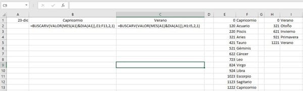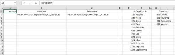 Si en A1 pongo una fecha cualquiera (día-mes-año), quiero que en B1 me resulte el signo zodiacal y en C1 me resulte la estación del año