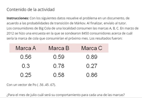 Ventas y MarketingMatemáticas panzer ve el 23 mar. 19 Los consumidores de Big Cola de una localidad consumen las marcas A, B, C. En marzo de 2012 se hizo una encuesta Seguir Siguiendo Dejar de seguir