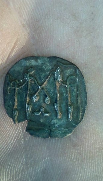 He encontrado esta pieza circular de cobre en el campo y no sé ni lo que es. Mide unos dos centímetros de diámetro y tiene unos extraños signos en una de sus caras. Están fabricados a base de hilo del mismo material soldados conformando un par de iniciales o grupos de flechas. No sé ni lo que es ni lo que representa.